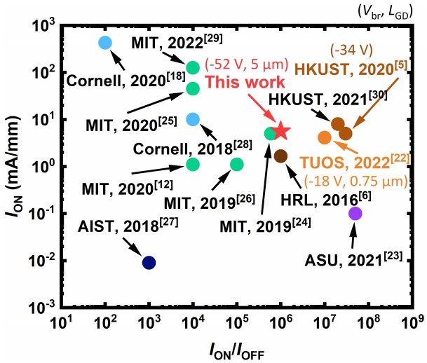 圖3. 本研究GaN基p-FETs的電流密度、電流開關比及擊穿電壓與國內外同類型器件對比圖