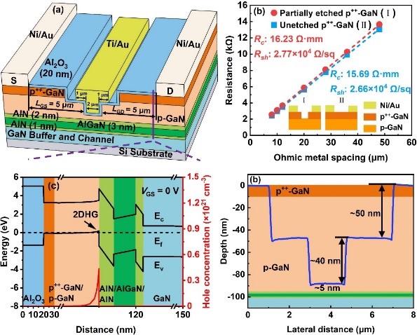 圖1.(a)GaN基p-FETs器件結構圖;(b)刻蝕與未刻蝕歐姆金屬之間p++-GaN的TLM測試結果圖;(c)接觸區能帶圖;(d)AFM測得的柵槽截面圖