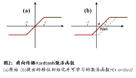針對上述問題,感知中心科研團隊提出了一種用于語音喚醒的極輕量化、高準確率的改進二值殘差神經(jīng)網(wǎng)絡B-ResNet(Binary Residual Neural Network,圖1),利用二值量化方法,將神經(jīng)網(wǎng)絡中的全精度權(quán)重、激活參數(shù)量化為1bit(+1,-1),顯著降低內(nèi)存占用,亦可將網(wǎng)絡中存在的大量浮點卷積乘加運算簡化為XNOR同或邏輯與popcount運算,大幅降低計算復雜度。為解決二值網(wǎng)絡帶來的精度下降問題,團隊在B-ResNet網(wǎng)絡前向傳播中提出了一種具有移位初始化且可學習的激活函數(shù)來優(yōu)化網(wǎng)絡各層激活值分布,降低信息損失(圖2),并在反向傳播過程中,提出了一種具有可變周期性窗口的梯度修正近似方法,有效解決了梯度失配與消失問題(圖3)。在GSCD(Google Speech Commands Dataset)標準語音數(shù)據(jù)集的12分類任務下,與基線網(wǎng)絡Res8-narrow相比,該技術(shù)可降低33%參數(shù)量與72%計算量,實現(xiàn)更高的語音喚醒精度,為后續(xù)該功能的低功耗硬件實現(xiàn)奠定了良好基礎。