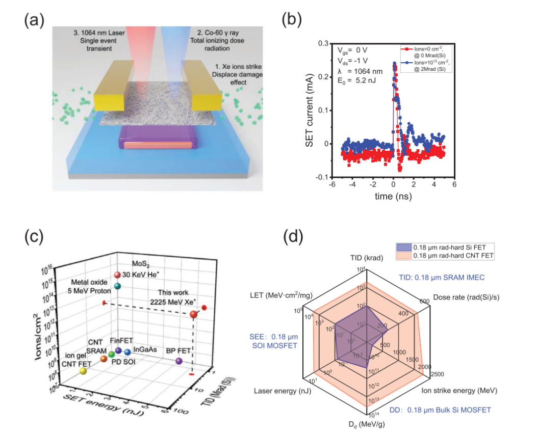該研究得到國家自然科學基金的支持。近日,研究成果以“Ultra-Strong Comprehensive Radiation Effect Tolerance in Carbon Nanotube Electronics”為題發表于國際著名期刊“Small”上(DOI:10.1002/smll.202204537)。抗輻照器件技術重點實驗室陸芃博士為該論文共同第一作者,李博研究員為該論文共同通訊作者。