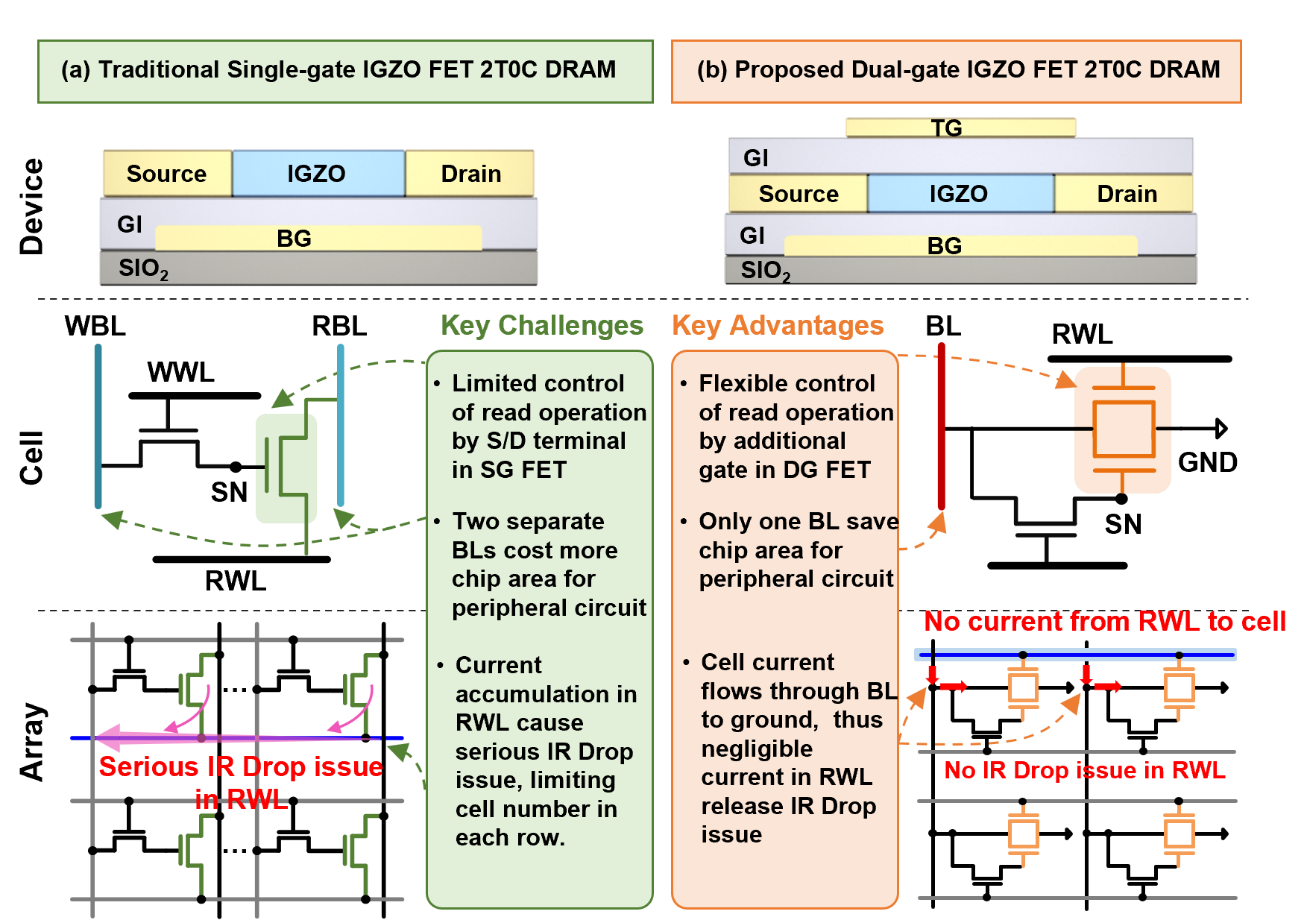 動(dòng)態(tài)隨機(jī)存儲(chǔ)器(DRAM)是存儲(chǔ)器領(lǐng)域中的一個(gè)重要分支。基于銦鎵鋅氧(IGZO)晶體管的2T0C無電容DRAM,有望突破傳統(tǒng)1T1C-DRAM的微縮限制、高刷新率等問題。但相比傳統(tǒng)的1T1C結(jié)構(gòu),2T0C-DRAM仍存在諸多挑戰(zhàn):由于其讀字線與寫字線位于讀晶體管的源漏端,存在潛在的電流分享路徑,不利于讀寫操作;兩條獨(dú)立的讀/寫位線使得電路布局布線更復(fù)雜,需要更復(fù)雜的外圍電路控制讀寫;在陣列級(jí)的DRAM上,讀字線存在嚴(yán)重的IR Drop問題,限制了陣列規(guī)模。