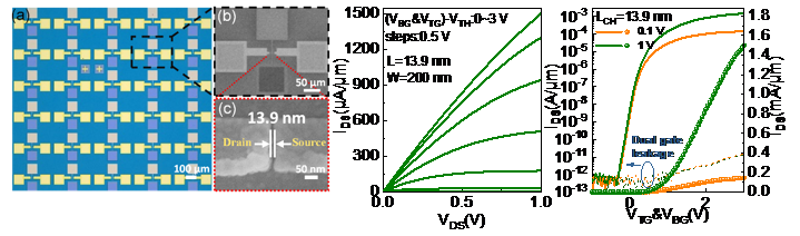 圖2短溝道雙柵晶體管光學(xué)顯微圖、SEM圖以及轉(zhuǎn)移輸出曲線