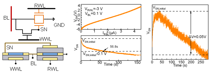圖3雙柵2T0C-DRAM示意圖以及保持時(shí)間測(cè)試