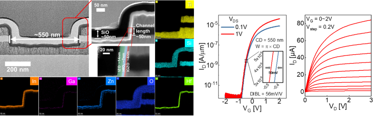 圖1 CAA IGZO FET的截面電鏡圖及轉(zhuǎn)移輸出曲線