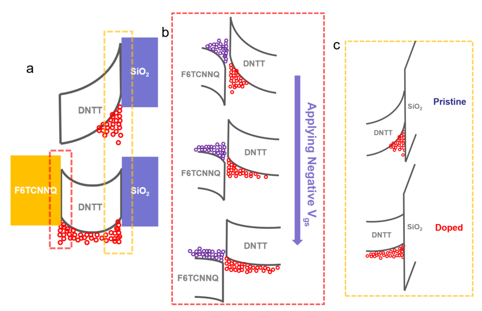 針對此問題,微電子所劉明院士團(tuán)隊(duì)制備了基于p型和n型有機(jī)分子構(gòu)成的單晶電荷轉(zhuǎn)移界面的晶體管器件,探究了電荷轉(zhuǎn)移界面以及柵氧界面電場的相互作用對晶體管工作時(shí)載流子及電導(dǎo)分布特性的影響。相較于界面,單晶體內(nèi)的缺陷態(tài)減少3個(gè)數(shù)量級以上,這意味著更小的散射概率和更高的器件遷移率。通過開爾文探針顯微鏡對表面電勢的柵壓依賴性表征和二維數(shù)值仿真,證實(shí)電荷轉(zhuǎn)移界面的內(nèi)建電場與柵氧界面電場發(fā)生有效耦合,提高了載流子體傳輸比例,減少了界面無序因素對載流子傳輸?shù)南拗谱饔茫蠓忍嵘似骷目鐚?dǎo)。