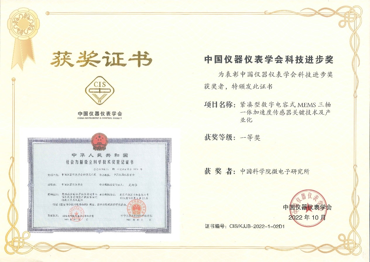 近日,微電子所新技術開發部微系統技術實驗室焦斌斌研究員團隊的“緊湊型數字電容式MEMS三軸一體加速度傳感器關鍵技術及產業化”項目,在中國儀器儀表學會2022年度項目評選中榮獲“科技進步一等獎”。