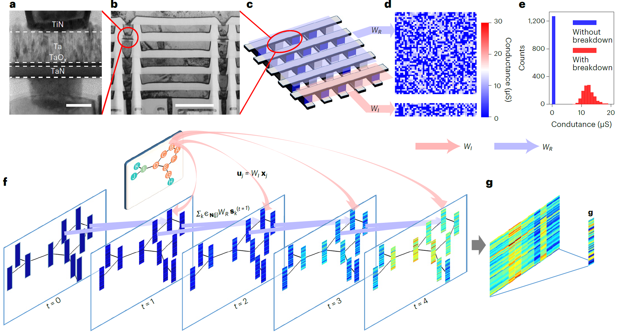 針對上述問題,微電子所微電子器件與集成技術重點實驗室劉明院士團隊尚大山研究員與香港大學電子工程系王中銳博士合作,開發了一種利用儲池計算(Reservoir Computing)技術實現圖結構化數據分類的技術——回聲狀態圖網絡(ESGNN)。儲池計算是循環神經網絡的一種簡化形式,能夠將時序輸入信號通過神經元的非線性激活函數轉換到一個高維空間中,再通過一個簡單線性回歸方法有效地讀出。儲池計算中循環連接層的權重始終固定不變,只需訓練輸出層權重,可最大限度降低訓練復雜度和訓練時間。在硬件方面,團隊利用RRAM的本征隨機性構建大規模隨機電阻陣列(圖1a-b),將其作為儲池網絡的初始化權重,具有低成本、可擴展優勢。在軟件方面,ESGNN巧妙運用了隨機電阻陣列帶來的物理隨機投影,以存內計算的方式完成圖嵌入過程,大大降低了圖神經網絡的訓練成本。團隊還通過軟—硬協同優化技術,在基于FPGA的板級測試平臺上實現了對MUTAG、COLLAB數據集的圖分類,進行了更大規模CORA數據集的節點分類仿真。相比傳統數字硬件系統,能效分別提升了2.16、35.42和40.37倍。該工作展現了RRAM陣列在構建邊緣圖學習系統方面的巨大潛力,也為利用自然界豐富的物理、化學性質開發更高效的智能硬件系統提供了參考。