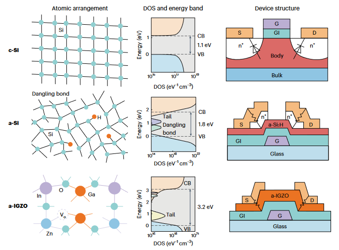 圖1單晶、非晶及氧化物半導體的原子排列、能帶結構和器件結構