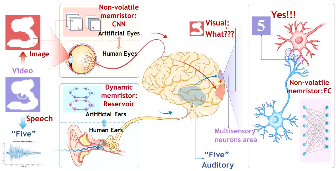 微電子所重點實驗室劉明院士團隊設計了一種新的3D垂直RRAM陣列,其中不同層器件分別具有非易失性和易失性,這使得它能夠構建多模態神經形態計算網絡。第1層器件(字線:TiN)和第2層器件(字線:Ru)分別表現出不同的動態特性,可以用于構建多時間尺度儲備池計算網絡;第3層器(WL:W)表現出了多比特存儲的非易失特性,可用于構建卷積神經網絡和全連接網絡等。第1層和第2層器件構建的多時間尺度儲備池計算網絡用來模擬人類的耳朵捕捉聲音信息,第3層器件一部分用于構建卷積神經網絡模擬人類的眼睛捕捉圖像信息,一部分構建全連接網絡用于多感官信號的分類和識別。利用三維多功能RRAM陣列,實現了一個真三維、多模態、多尺度的神經形態計算系統,表現出了高精度(98%)和高面積效率(6 TOPS/mm2)的特點。