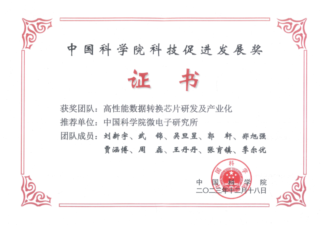 2023年12月23日,中國科學院在2024年度工作會議上公布了2023年度中國科學院科技促進發展獎獲獎名單,由中國科學院微電子研究所完成的“高性能數據轉換芯片研發及產業化”項目榮獲2023年度中國科學院科技促進發展獎。
