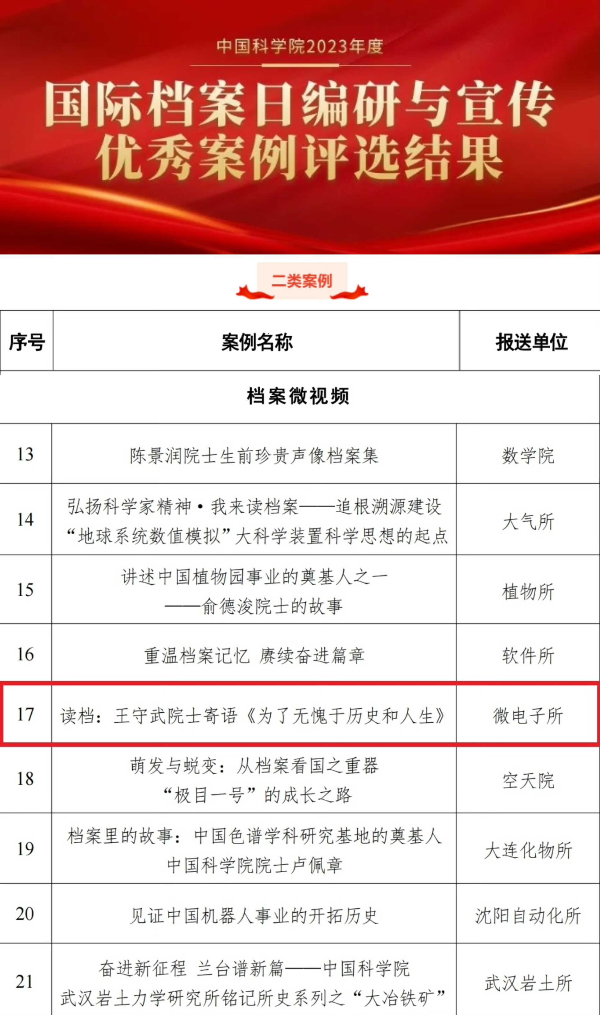 5月14日,中國科學院檔案館公布2023年度國際檔案日編研與宣傳優(yōu)秀案例評選結果,微電子所制作的檔案微視頻《讀檔:王守武院士寄語〈為了無愧于歷史和人生〉》被評為二類案例。