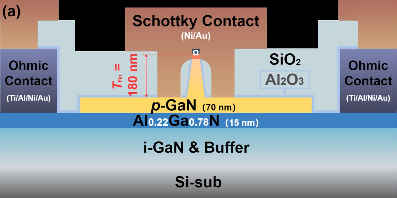 ????作為目前主流的增強型商用GaN功率器件,p-GaN柵極HEMT技術路線因具有良好的閾值均勻性受到廣泛關注。其中,肖特基接觸型p-GaN HEMT器件具有較小的柵極漏電和較大的柵極擺幅,但其存在閾值電壓不穩定的問題;歐姆接觸型p-GaN HEMT器件(也被稱為柵極注入晶體管,Gate injection transistor)盡管具有良好的閾值電壓穩定性,但存在顯著的柵極漏電問題。戴心玥博士創新提出了一種具有歐姆島鑲嵌的p-GaN柵(Island Ohmic p-GaN gate, 簡稱IO-PGaN)增強型AlGaN/GaN HEMT器件結構,成功實現了穩定的閾值電壓和較大的柵極擺幅。通過定制含有Mg重摻雜蓋帽層的外延結構,在歐姆島頂部實現良好的p型歐姆接觸,其余部分為肖特基接觸。此外,歐姆島側壁的肖特基接觸與頂部的歐姆接觸可以等效為一個常開型p-FET,當歐姆島結構足夠“窄長”、或歐姆島結構摻雜濃度足夠低時,側壁耗盡層更易夾斷溝道,該等效 p-FET 的閾值電壓增大,可實現柵極漏電的自鉗位。實驗結果表明,該結構繼承了肖特基型p-GaN柵器件的低漏電優勢和歐姆柵器件良好的閾值穩定性特點,在高柵壓和漏壓偏置工作條件下均能實現低柵極漏電和穩定的閾值電壓,所制備的器件具有較陡峭的亞閾值擺幅。這項研究為提升商用p-GaN柵功率器件的可靠性提供了新的思路,具有重要的應用前景。