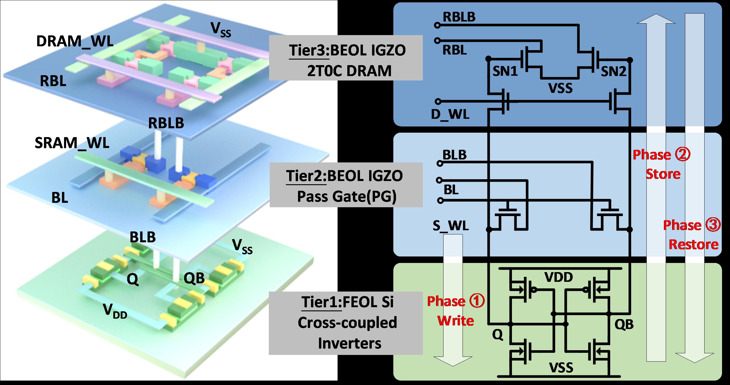 針對上述問題,微電子所集成電路制造技術重點實驗室劉明院士/李泠研究員團隊通過多層堆疊IGZO薄膜晶體管(TFT)與硅基電路后道集成,提出了一種新型IGZO/Si SRAM和IGZO 2T0C DRAM的三維存儲結構,成功實現(xiàn)了高密度、低能耗和高速數(shù)據(jù)傳輸?shù)忍匦浴T谠摻Y構中,通過在前道硅基閂鎖結構上后道集成IGZO傳輸門,有效地減少了SRAM的占用空間和待機功耗。此外,基于垂直堆疊三層間互連結構,實現(xiàn)了SRAM-DRAM數(shù)據(jù)傳輸?shù)淖畹脱舆t(<10ns)和最低能耗(2.26fJ)。同時,IGZO 2T0C DRAM的高數(shù)據(jù)保持特性使SRAM能夠在長時間斷電(>5000s)后不丟失數(shù)據(jù)以降低待機功耗。