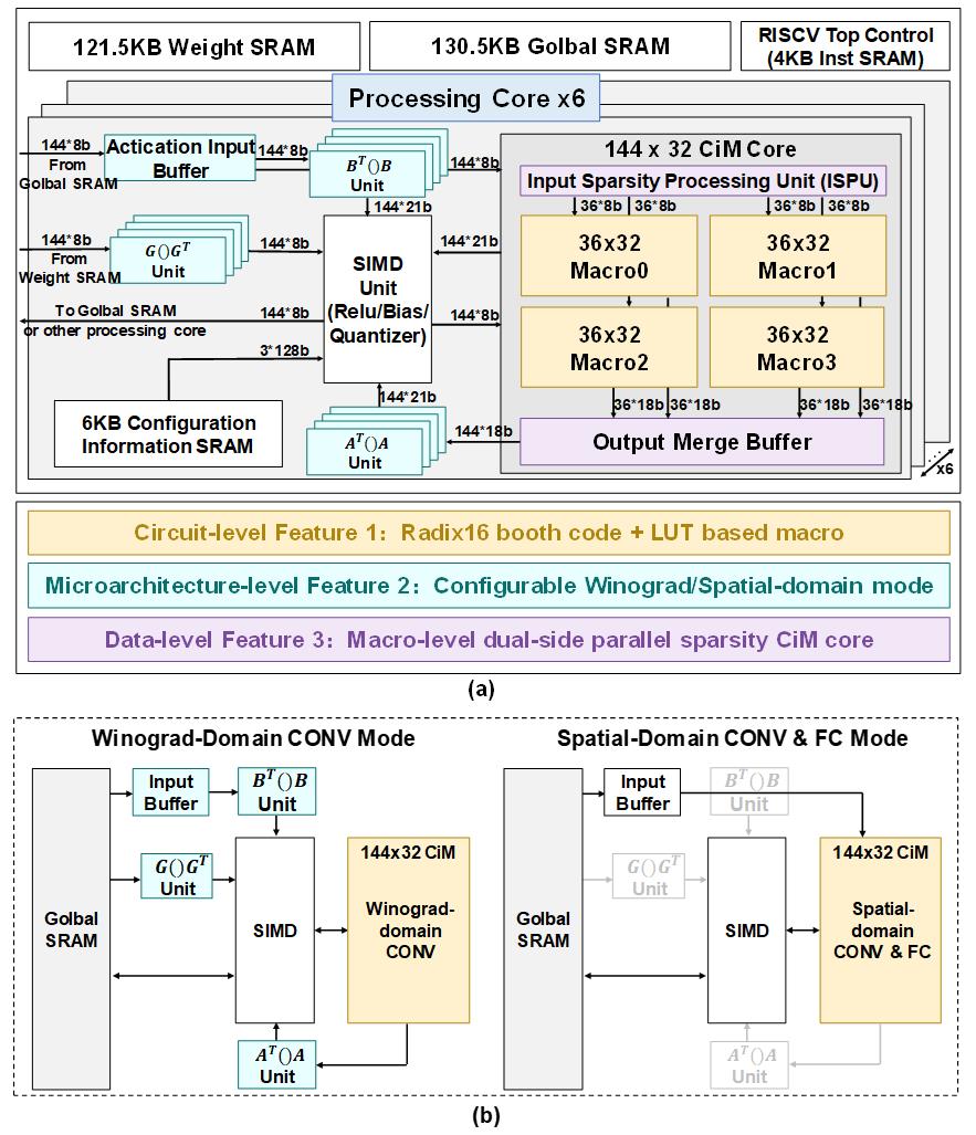 ????上述研究成果以題為“A 28-nm 19.9-to-258.5-TOPS/W 8b Digital Computing-in-Memory Processor With Two-Cycle Macro Featuring Winograd-Domain Convolution and Macro-Level Parallel Dual-Side Sparsity”發(fā)表在集成電路設(shè)計(jì)領(lǐng)域旗艦期刊IEEE Journal of Solid-State Circuits上,微電子所博士研究生吳昊為第一作者,微電子所張鋒研究員與清華大學(xué)陳勇教授為通訊作者。該研究得到了科技部重點(diǎn)研發(fā)計(jì)劃、國家自然科學(xué)基金、中國科學(xué)院戰(zhàn)略先導(dǎo)專項(xiàng)等項(xiàng)目的支持。