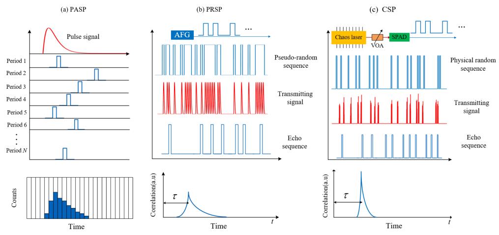 單光子激光探測技術(shù)是當前研究熱點,具有光子級靈敏度、0/1輸出和易于陣列化等特性,從根本上提高了對光信號的利用率并改變了數(shù)據(jù)處理方式。團隊針對單光子探測技術(shù)中光子級靈敏度易受噪聲干擾等問題,建立探測理論模型指導(dǎo)系統(tǒng)設(shè)計工作。依托原有光子計數(shù)激光雷達開發(fā)經(jīng)驗,在國際上首次提出了利用單光子雪崩光電二極管(Single photon avalanche diode,SPAD)探測器響應(yīng)物理隨機的光混沌信號產(chǎn)生真隨機序列,通過物理隨機編碼技術(shù)實現(xiàn)了高效且強魯棒特性的混沌單光子探測。該系統(tǒng)相較于傳統(tǒng)脈沖累積單光子激光雷達與偽隨機編碼單光子激光雷達,在解決了去模糊距離問題后,其抗干擾、抗串擾等指標也有著顯著提升。相關(guān)研究成果系統(tǒng)設(shè)計與性能分析研究成果分別發(fā)表在“Applied Optics:Improving the ranging performance of chaos LiDAR”、“Optics Express:Chaos single photon Lidar and the ranging performance analysis based on Monte Carlo simulation”、“Optics and Laser Technology:Efficient and robust chaos single photon lidar”、“集成技術(shù):數(shù)字混沌激光雷達”等期刊。