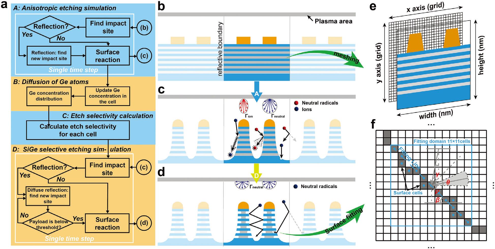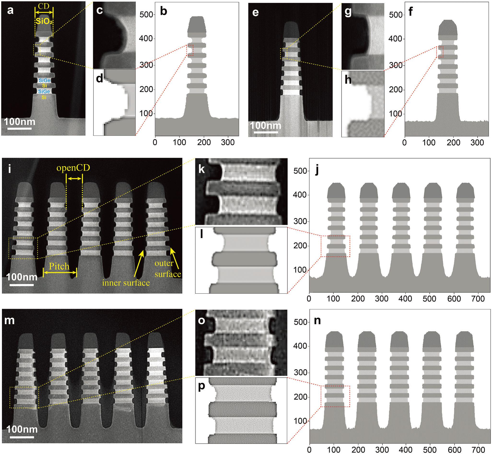 針對GAA內(nèi)側(cè)墻結(jié)構(gòu)Si/SiGe疊層橫向選擇性刻蝕工藝面臨的形貌缺陷和均勻性問題,微電子研究所EDA中心陳睿研究員與先導中心李俊杰高級工程師、南方科技大學王中銳教授、維也納工業(yè)大學Lado Filipovic教授合作,通過提出全新的Ge原子解吸附和擴散的模擬算法,建立了基于蒙特卡洛方法的連續(xù)兩步干法刻蝕工藝輪廓仿真模型,實現(xiàn)了針對Si/SiGe六疊層結(jié)構(gòu)的橫向選擇性刻蝕工藝輪廓仿真,并完成了相應結(jié)構(gòu)的流片實驗。通過結(jié)合形貌仿真和透射電子顯微鏡(TEM)表征,探究了Ge層刻蝕表面圓化現(xiàn)象,以及腔體氣壓等參數(shù)對刻蝕形貌均勻性的影響機制。該項工作為闡明新原理刻蝕工藝機理和優(yōu)化工藝性能提供了理論和實驗參考。