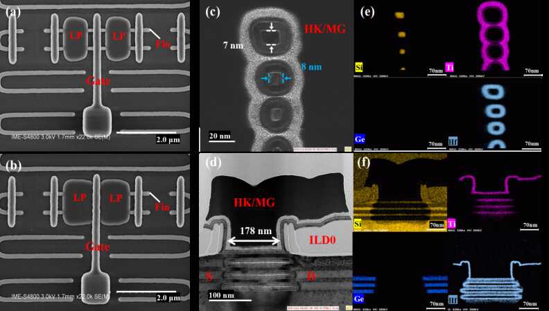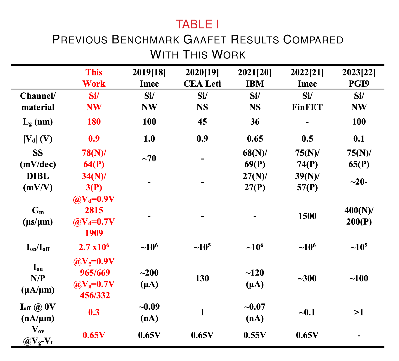 為了突破GAA 器件中嚴重的源漏選擇外延缺陷產生的高寄生電阻和低驅動性能挑戰,微電子所集成電路先導工藝研發團隊提出了一種與GAA制造工藝兼容的近自對準支撐臺(Quasi-Self-Aligned Landing Pads)技術,實現GAA器件中多層堆疊納米片溝道和單晶 SiGe/Si 超晶格源極/漏極(SD)結構之間的無缺陷連接,同時避免離子注入摻雜引起的源漏缺陷與多晶態。實驗結果表明,采用 QSA LPs 技術的 GAA器件的寄生 SD 電阻 (RSD)降低至100Ω,開態電流 (Ion) 值達到 965 μA/μm,達到世界先進水平(見表1),為高性能GAA電路應用提供了一種創新技術方案。