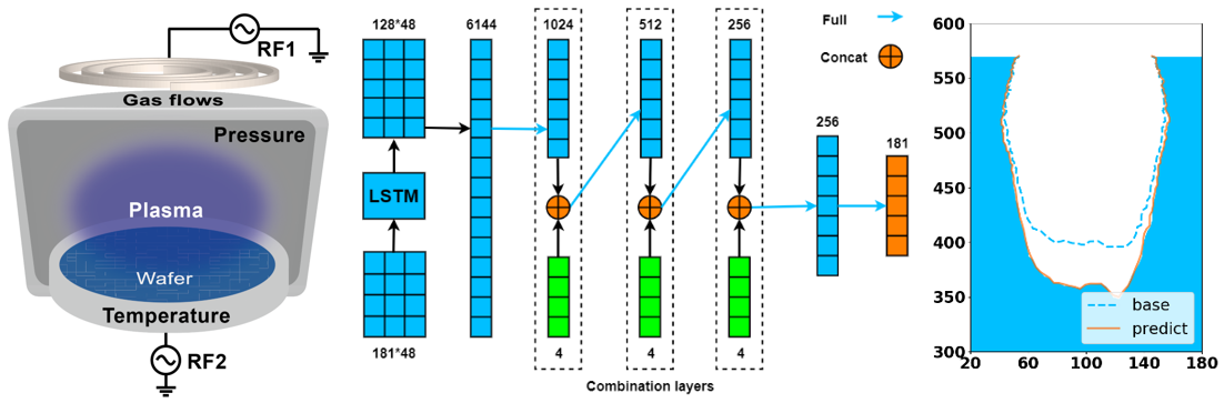 在刻蝕工藝的仿真加速方面,EDA中心姚振杰副研究員和陳睿研究員開展聯(lián)合攻關,提出一種級聯(lián)遞歸神經(jīng)網(wǎng)絡(CRNN),該模型通過遞歸神經(jīng)網(wǎng)絡充分表征刻蝕輪廓,通過級聯(lián)組合層實現(xiàn)輪廓特征與工藝參數(shù)的(如壓力、功率、溫度和電壓)的信息融合。通過仿真和實驗數(shù)據(jù)驗證,與傳統(tǒng)刻蝕模型仿真結果對比,CRNN模型在保證預測精度的前提下,顯著提升了建模效率,驗證了人工智能在工藝建模方面的計算效率優(yōu)勢。
