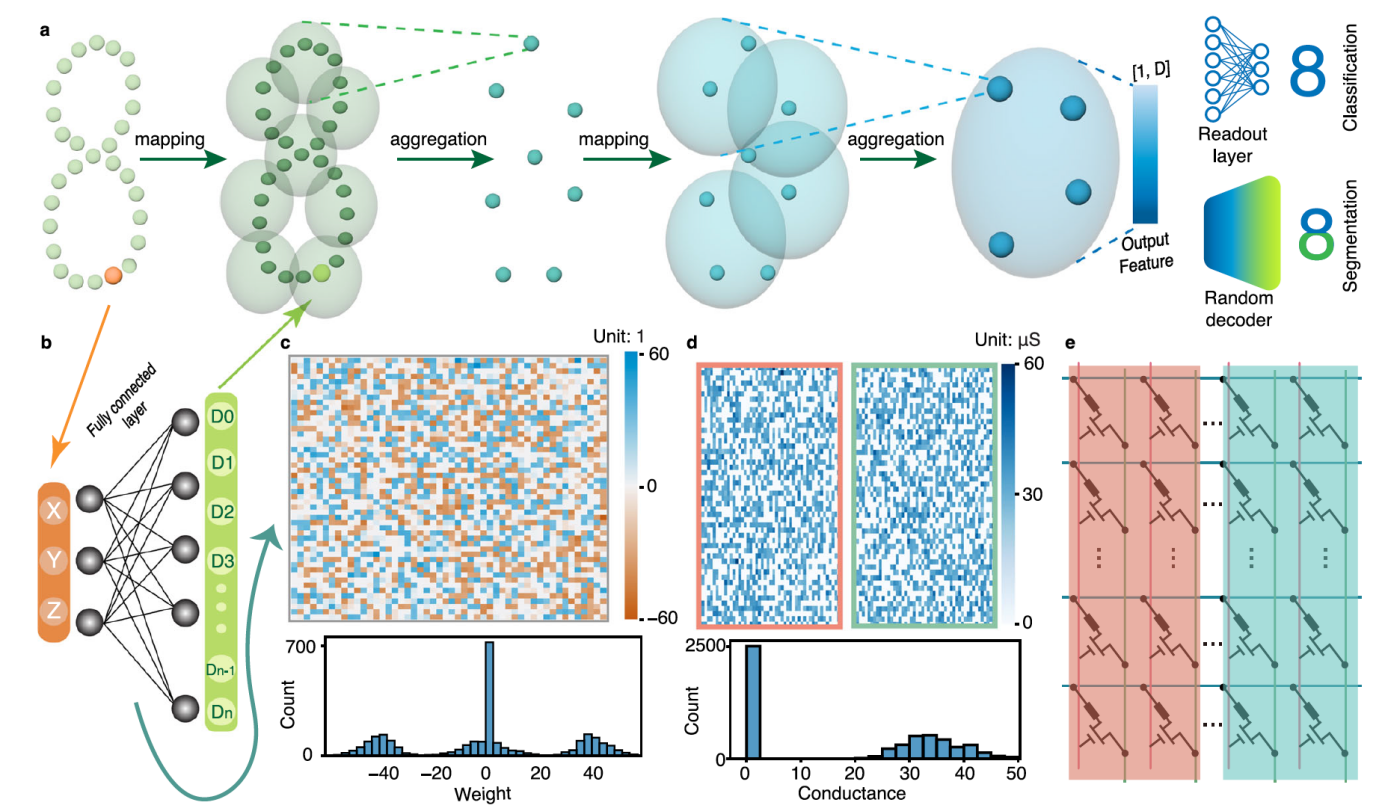 近日,中國科學院微電子研究所集成電路制造技術全國重點實驗室尚大山研究員與南方科技大學深港微電子學院王中銳博士合作,通過軟硬件協同設計,開發了基于隨機阻變存儲器的深度極限點云學習機系統。本研究提出一種新穎的軟硬件協同設計系統—基于隨機電阻存儲器的深度極限點云學習機(DEPLM),可支持高效統一的點集分析。從數據層面,將多模態數據統一表示為點集,從而實現通用化處理;從軟件層面,團隊首次提出深度極限點云學習機,大部分權重無需訓練,大幅降低了訓練復雜度;從硬件層面,阻變存儲器不僅可以實現存儲與計算的一體化,還利用其固有的編程隨機性生成DEPLM的隨機稀疏權重,從而抑制了讀取噪聲的影響。合作團隊在多種數據類型和兩類學習任務中驗證了該系統的普適性。與傳統數字硬件系統相比,該協同設計系統實現了能效提升,同時降低了訓練成本。這種基于隨機阻變存儲器的深度極限點云學習機,有望為跨模態、跨任務的高能效、易訓練邊緣智能系統開辟新路徑。