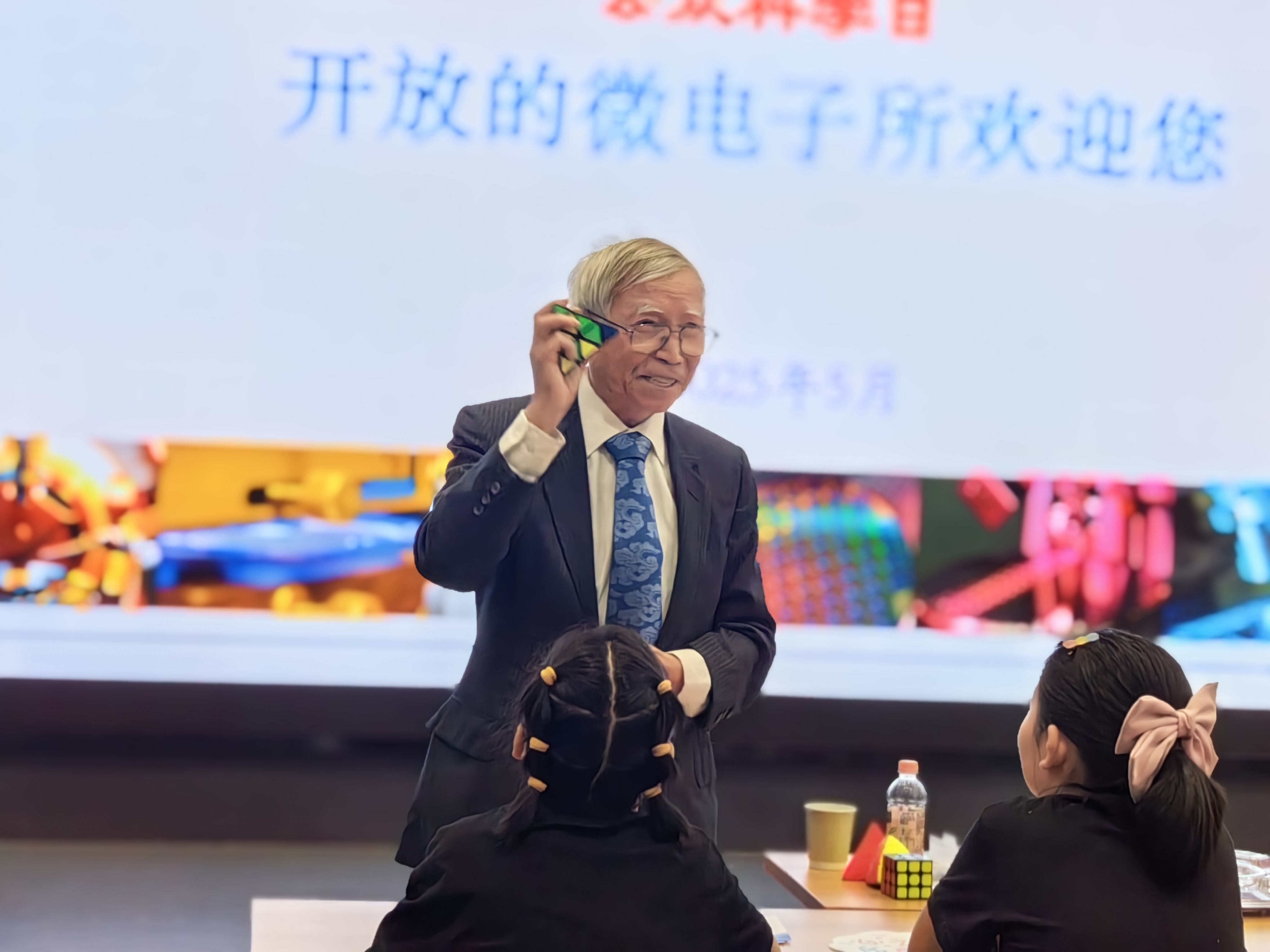 “大咖面對面—主題講座”環(huán)節(jié):“魔方爺爺”陳寶欽研究員作題為《微電子如何把沙子煉造成芯片》報告,從光刻技術發(fā)展史到奇妙的原子世界,從太空探索計劃到把沙子煉成芯片,深入淺出地將深奧的微電子科學技術轉(zhuǎn)化為淺顯易懂的生活科普,將豐富的科研歷程轉(zhuǎn)化為做人做事的道理。《芯片小子本領大》主題報告以生動語言揭秘芯片存儲、設計等領域研發(fā)成果,通過圖片展示、視頻播放、顯微鏡觀察等呈現(xiàn)深奧的科學原理。《如何用光刻出芯片》主題報告特別安排了實踐體驗環(huán)節(jié),孩子們動手參與“光刻模擬實驗”,通過用紫外線燈親手操作圖案投射,通過電子顯微鏡等設備,觀察頭發(fā)絲與芯片內(nèi)部的尺寸對比。現(xiàn)場觀眾熱情滿滿,孩子們不時對精彩演示發(fā)出陣陣驚嘆,將活動氣氛推向高潮。