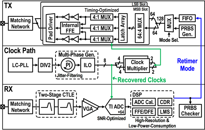 圖1. 提出的基于ADC-DSP架構(gòu)的112-Gb/s PAM-4調(diào)制重定時(shí)收發(fā)機(jī)