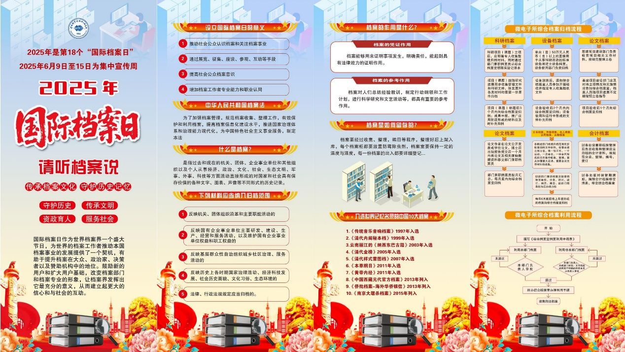 6月9日是“國際檔案日”。為切實增強全所職工的檔案意識,按照中國科學(xué)院檔案館有關(guān)部署要求,微電子所圍繞“請聽檔案說”主題,于6月6日至16日組織開展了一系列檔案宣傳活動。??