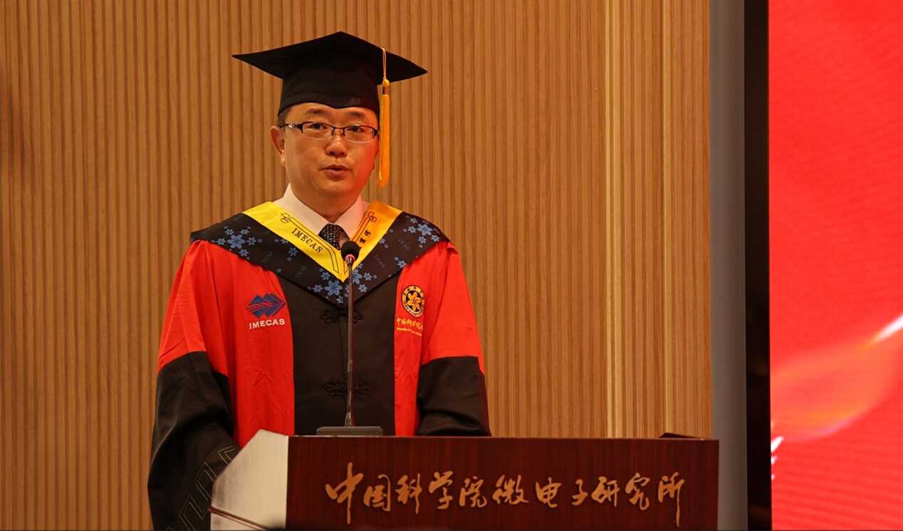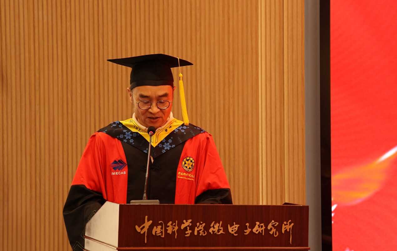 ????導師代表韋亞一研究員發言。他表達了對畢業生們的熱烈祝賀與殷切期望,強調微電子領域“微而有力”的重要性,勉勵同學們在集成電路技術變革的關鍵時期,要勇敢接過歷史的接力棒,以無畏勇氣直面未來挑戰。
