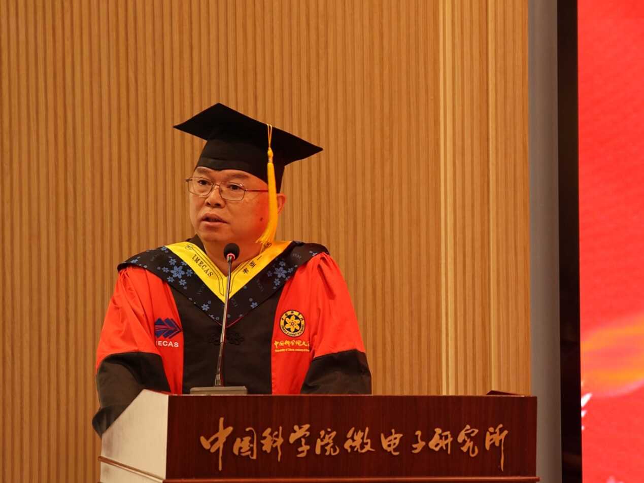 2025年6月17日,中國科學院微電子研究所暨中國科學院大學集成電路學院2025屆研究生畢業典禮在微電子所八樓多功能會議廳隆重舉行。微電子所所長、黨委書記、集成電路學院院長戴博偉,黨委副書記、紀委書記謝光鋒,副所長曹立強,副所長、集成電路學院副院長李泠、羅軍,集成電路學院執行院長焦建彬,導師代表,2025屆畢業生及親屬等300余人共同出席。典禮由教育處處長王盛凱主持。