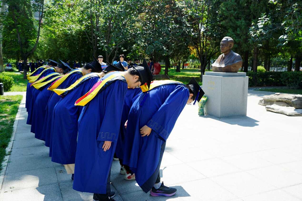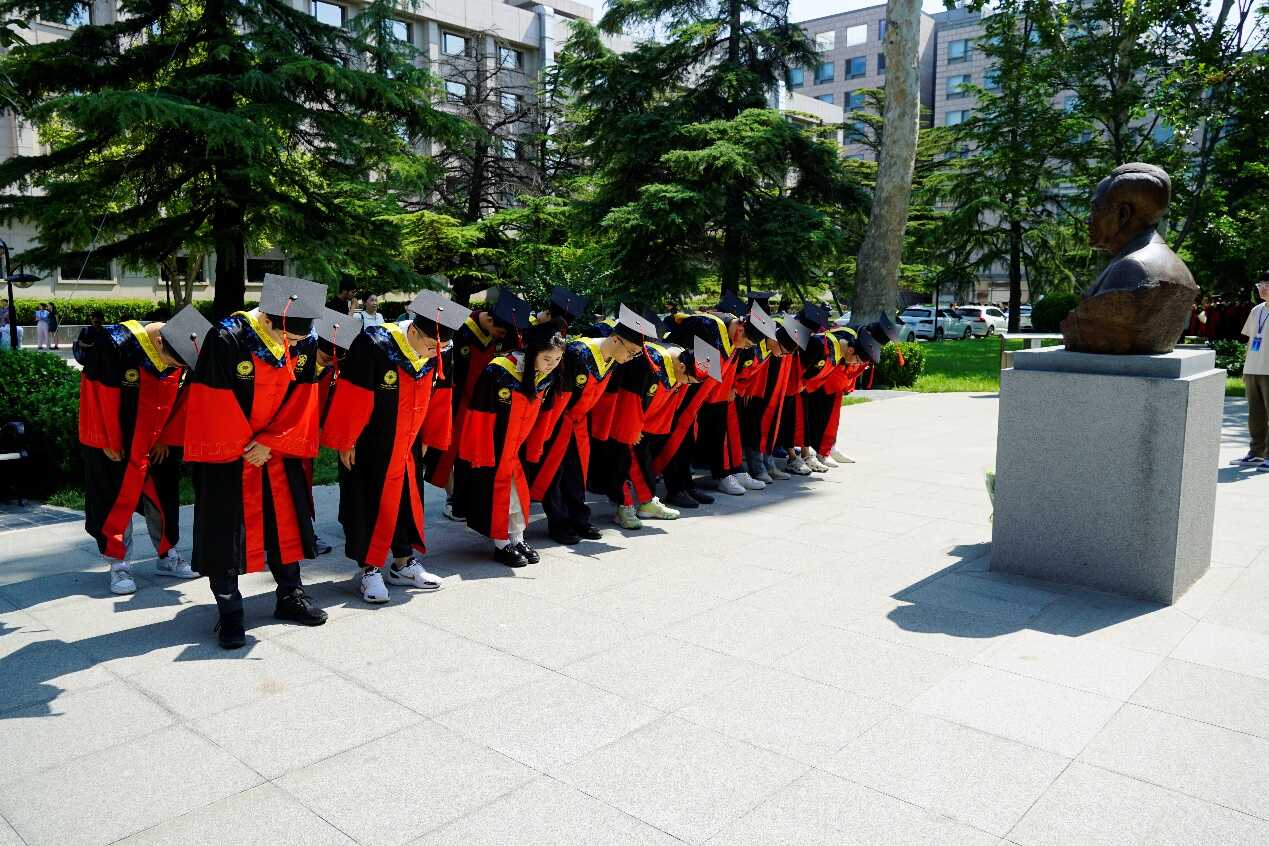 ????在撥穗儀式中,畢業生們身著學位服,莊重地向著王守武先生的雕像獻花鞠躬,并有序接受導師們的撥穗,寓意著畢業生們將賡續“芯”火,傳承老一輩科學家精神,為加快實現高水平科技自立自強和建設科技強國作出更大貢獻。