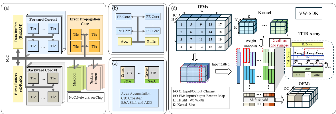 針對(duì)上述問題,中國科學(xué)院微電子研究所集成電路制造技術(shù)全國重點(diǎn)實(shí)驗(yàn)室研究團(tuán)隊(duì),通過算法與硬件協(xié)同設(shè)計(jì),在小批次學(xué)習(xí)場(chǎng)景下實(shí)現(xiàn)了邊緣端脈沖神經(jīng)網(wǎng)絡(luò)的高能效訓(xùn)練。團(tuán)隊(duì)提出了一種硬件友好的訓(xùn)練算法——脈沖直連反饋對(duì)齊(SDFA),在誤差反向傳播過程中構(gòu)建了直連反饋路徑,其中反饋權(quán)重采用全隨機(jī)矩陣,且在訓(xùn)練過程中保持固定,無需更新,大幅降低了計(jì)算與存儲(chǔ)開銷。在硬件層面,團(tuán)隊(duì)設(shè)計(jì)了名為 PipeSDFA 的高效憶阻存內(nèi)計(jì)算架構(gòu),充分利用 SDFA 的算法特性,實(shí)現(xiàn)了時(shí)間步、數(shù)據(jù)與批處理的三級(jí)流水線并行處理。該架構(gòu)還借助憶阻器件的本征隨機(jī)性,高效存儲(chǔ)固定的隨機(jī)反饋矩陣。為進(jìn)一步提升計(jì)算能效,團(tuán)隊(duì)引入了輸入數(shù)據(jù)復(fù)用機(jī)制,并提出了高效權(quán)重映射方案(vw-SDK),有效優(yōu)化了計(jì)算資源的利用。實(shí)驗(yàn)結(jié)果表明,SDFA 算法在多個(gè)數(shù)據(jù)集上保持了與基線方法相當(dāng)?shù)哪P途龋瑩p失不超過 2%。在硬件效能方面,PipeSDFA 架構(gòu)相比已有的 RRAM-CIM 架構(gòu)(如 PipeLayer),計(jì)算速度提升1.1~10.5倍,能效比提升 1.37~2.1倍。這一研究結(jié)果有效解決了邊緣設(shè)備訓(xùn)練中的硬件效率瓶頸,為神經(jīng)形態(tài)計(jì)算系統(tǒng)在資源受限環(huán)境中的實(shí)際應(yīng)用提供了可擴(kuò)展的解決方案。