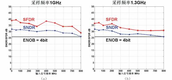 圖為超高速ADC在采樣頻率為1GHz和1.3GHz時,動態性能指標隨輸入信號頻率變化的測試結果。
