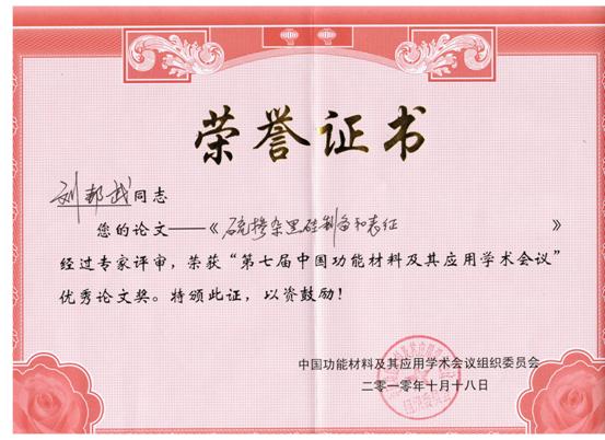 由于劉邦武的研究工作具有世界原創性、新穎性、重要性的特點,其報告受到了第七屆中國功能材料及其應用學術會議與會專家的高度評價,經過專家的評審和推薦,其論文被評為會議優秀論文。