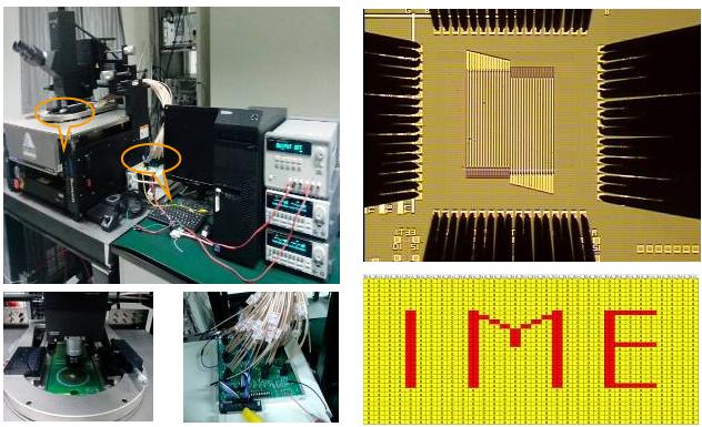 圖2 (a) 探針卡下RRAM 1kb芯片實(shí)物圖; (b) 陣列中寫入的‘IME’字樣位圖。