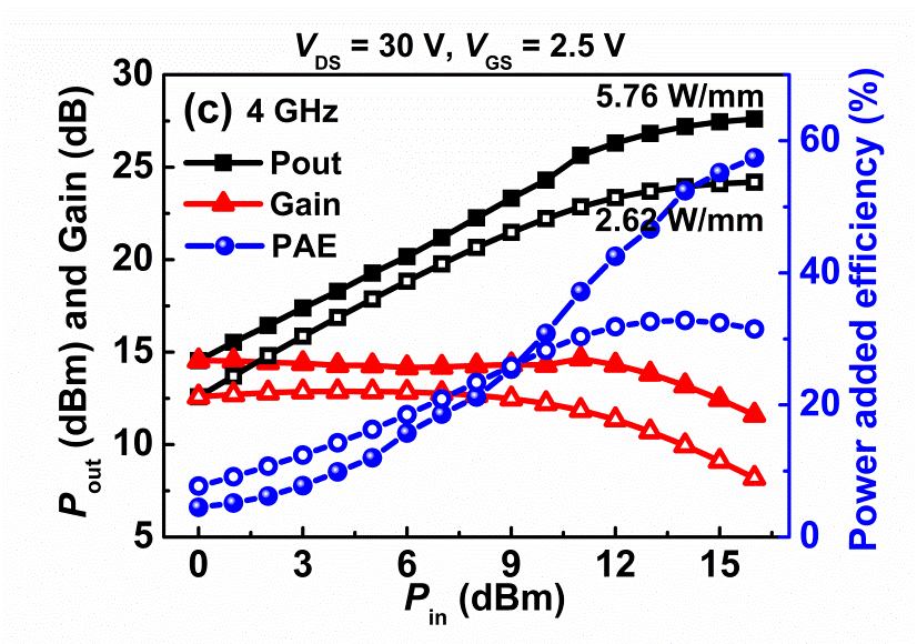 該增強(qiáng)型MIS-HEMT器件在4GHz下的脈沖輸出功率達(dá)到5.76 W/mm,功率附加效率57%,高于國際上報(bào)道的閾值電壓超過+1.5V MIS-HEMT器件的功率性能(如圖2(c)所示)。該增強(qiáng)型GaN MIS-HEMT的成功研制突破了柵槽刻蝕技術(shù)制備GaN功率電子器件的瓶頸,為進(jìn)一步提高氮化鎵電子器件的工作頻率(10 MHz以上)和轉(zhuǎn)換效率奠定了扎實(shí)基礎(chǔ)。
