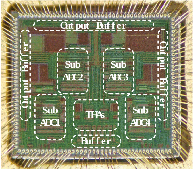 30Gsps 6bit ADC芯片面積為3.9mm x 3.3mm ,采用4路交織技術,子ADC采用自主創新的折疊內插架構。芯片內部集成三項誤差校準電路,通過與FPGA配合可實現通道之間的自動校準。芯片輸出采用24路高速串行數據接口,支持在30GSps采樣率下全速率輸出。芯片的最高采樣率為30Gsps,每秒可產生300億次模數轉換,總功耗為8W。該款芯片的-3dB帶寬為18GHz。在30Gsps采樣率下,低頻有效位達到5bit ,高頻有效位大于3.5bit ,無雜散動態范圍(SFDR)大于35dBc。
