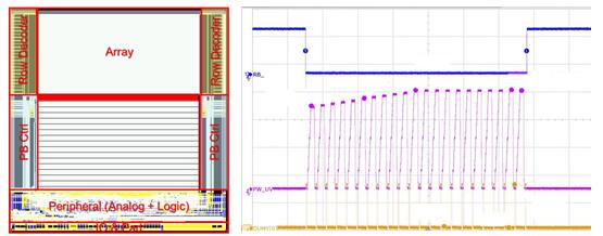 圖2. 芯片版圖布局(左),擦除操作測試波形(右)