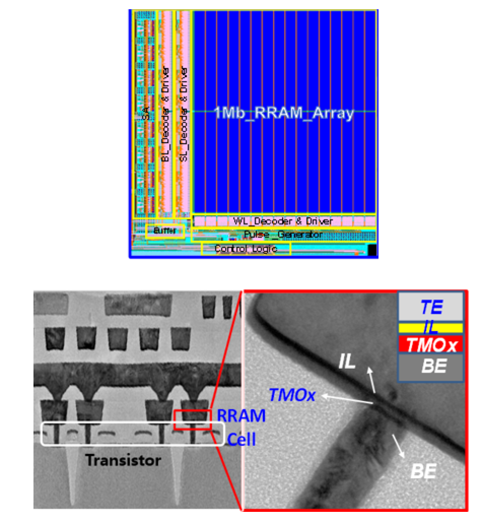 上圖:28nm RRAM 1Mb芯片版圖;下圖:28nm RRAM單元TEM界面圖