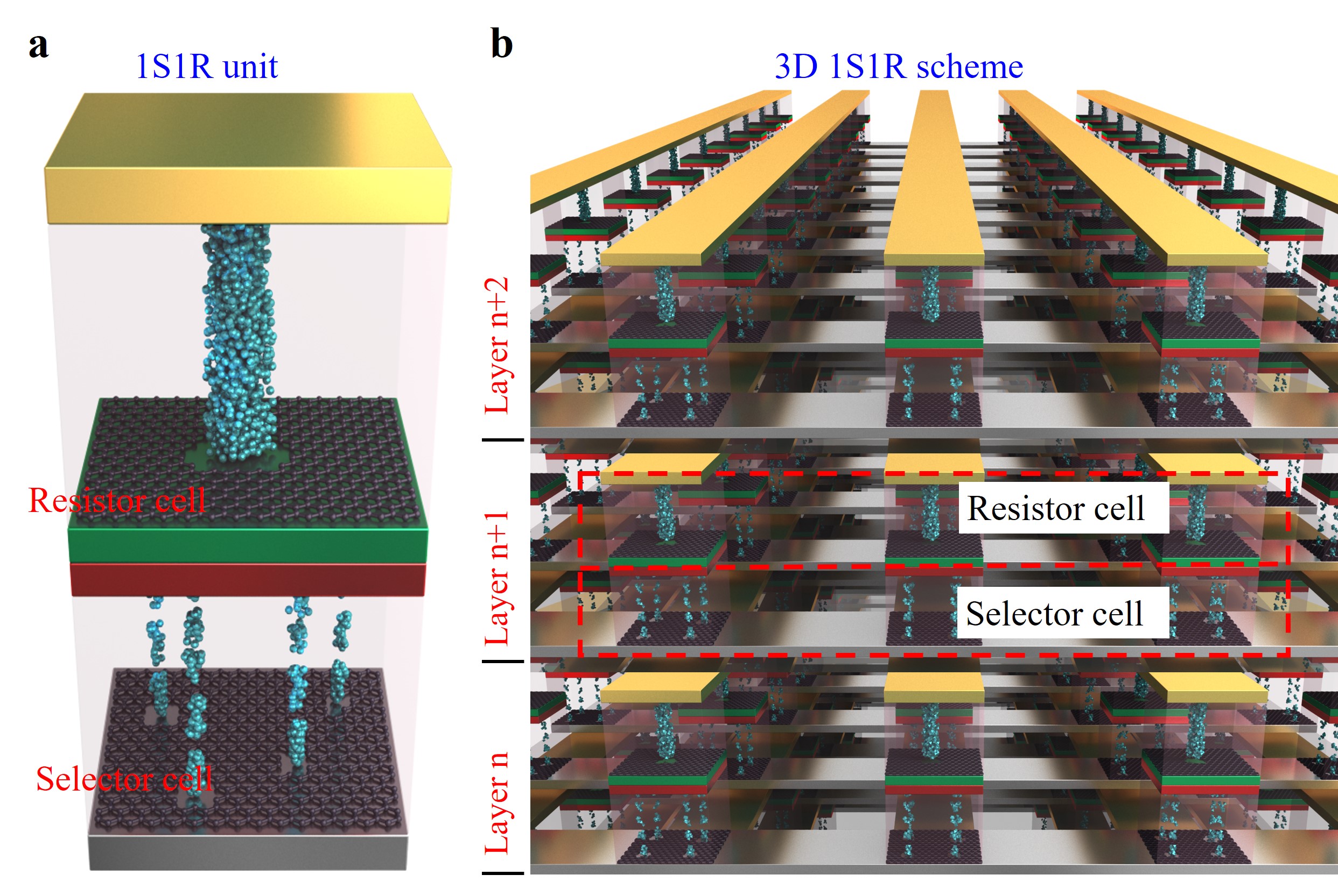 針對(duì)上述問題,劉明院士團(tuán)隊(duì)提出通過石墨烯缺陷工程控制活性電極離子向阻變功能層中注入的路徑尺寸和數(shù)量,集中化/離散化陽離子基阻變器件中導(dǎo)電通路的分布來調(diào)控其穩(wěn)定性。此類調(diào)控方法也可看作是 “一根筷子輕輕被折斷,十雙筷子牢牢抱成團(tuán)”的東方哲學(xué)思想的一種科學(xué)運(yùn)用。該方法打破了阻變器件中電流-保持困境的經(jīng)典難題,不僅獲得了高驅(qū)動(dòng)電流(雙向500μA)、低保持特性的易失性選擇器圖1a),而且獲得了低操作電流(1μA)、高保持特性的非易失性存儲(chǔ)器(圖1b),這就為阻變存儲(chǔ)器的1S1R方案3D高密度集成奠定了基礎(chǔ)(圖2)。此工作是該領(lǐng)域首次在相同結(jié)構(gòu)阻變器件中實(shí)現(xiàn)電流-保持特性的雙向調(diào)控,這種通用的基于二維材料阻擋概念的離子遷移調(diào)控方法,也能夠移植應(yīng)用到離子電池,離子傳感等研究領(lǐng)域。