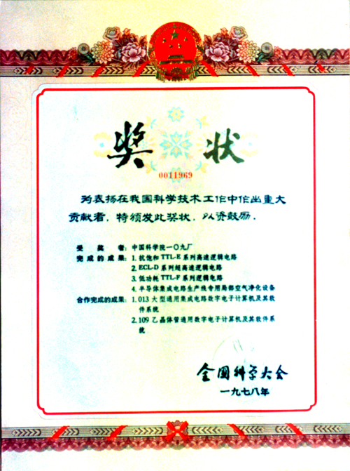 同年,抗飽和TTL-E系列高速邏輯電路、ECL-D系列超高速邏輯電路、低功耗TTL-F系列邏輯電路、半導(dǎo)體集成電路生產(chǎn)線專用局部空氣凈化設(shè)備四項(xiàng)獨(dú)立完成成果以及013大型通用集成電路數(shù)字電子計(jì)算機(jī)及其軟件系統(tǒng)、109乙晶體管通用數(shù)字電子計(jì)算機(jī)及其軟件系統(tǒng)兩項(xiàng)合作完成成果榮獲全國科學(xué)大會(huì)成果獎(jiǎng)。