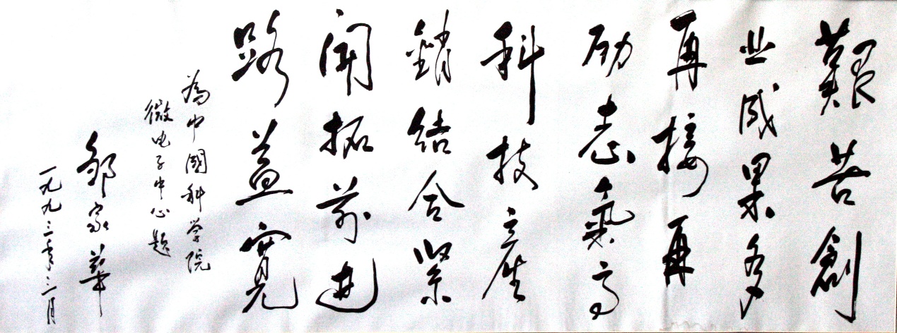 3月,中央政治局委員、國務院副總理鄒家華在中科院院長周光召等領導同志陪同下,視察微電子中心,并題詞:“艱苦創(chuàng)業(yè)成果多,再接再勵志氣高,科技產(chǎn)銷結合緊,開拓前進路益寬。”