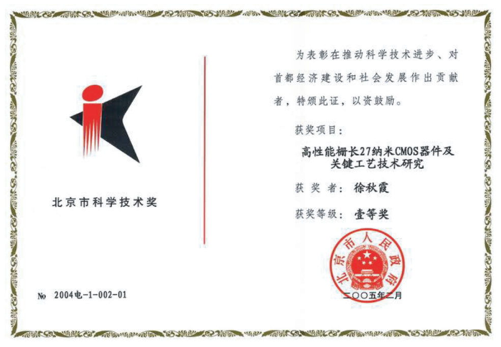 2月,“高性能柵長(zhǎng)27納米 CMOS器件及關(guān)鍵工藝技術(shù)研究”獲北京市科學(xué)技術(shù)一等獎(jiǎng)。