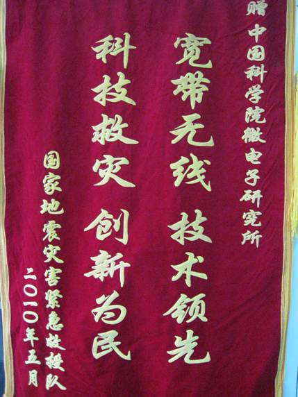 國家地震災(zāi)害緊急救援隊向微電子所贈送“寬帶無線技術(shù)領(lǐng)先,科技救災(zāi)創(chuàng)新為民”錦旗,對微電子所在青海玉樹抗震救災(zāi)期間提供的寬帶無線通信服務(wù)表示衷心感謝。